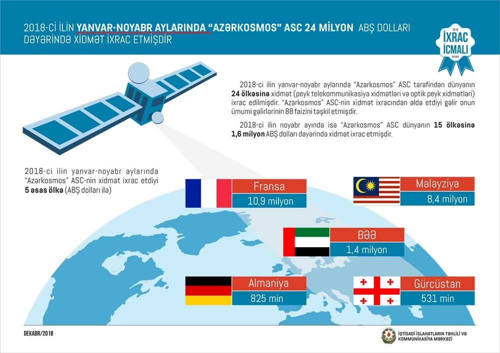 “Marja” xəbər ki, “İxrac İcmalı”nda həm də xidmət ixracına yer ayrılıb. Göstərilib ki, 2018-ci ilin yanvar-noyabr aylarında “Azərkosmos” ASC tərəfindən dünyanın 24 ölkəsinə 24 milyon ABŞ dolları dəyərində xidmət (peyk telekommunikasiya xidmətləri və optik peyk xidmətləri) ixrac edilib.