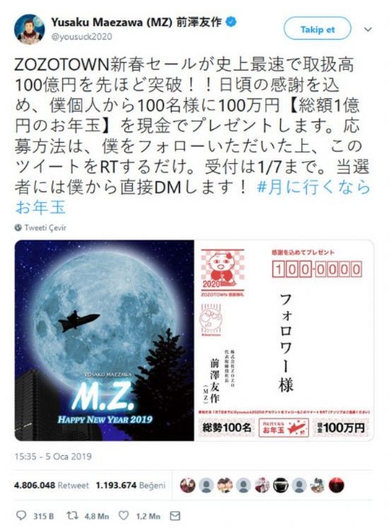 BBC-də yer alan xəbərə görə, internet üzərindən paltar satışı edən "Zozotow"nın banisi Maezawa, 5 Yanvardakı Twitter mesajını paylaşacaq adamlar arasında çəkilişlə müəyyənləşdiriləcək 100 qalibə cəmi 10 milyon Yapon Yeni (təxminən 925 min dollar) vəd edib.