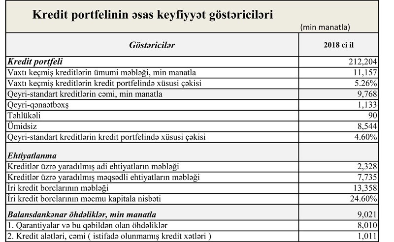 İllik müqayisədə “NBC Bank”ın kredit portfeli (məqsədli ehtiyatlar çıxılmaqla) təxminən 50 milyon manat və ya 32% artaraq 204 milyon 469 min manata çatıb. 2017-ci ilin sonunda “NBC Bank”ın müştərilərə verdiyi kreditlər 154 milyon 396 min manat təşkil etmişdi.
