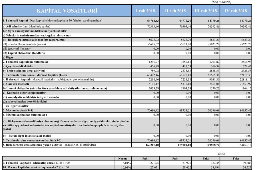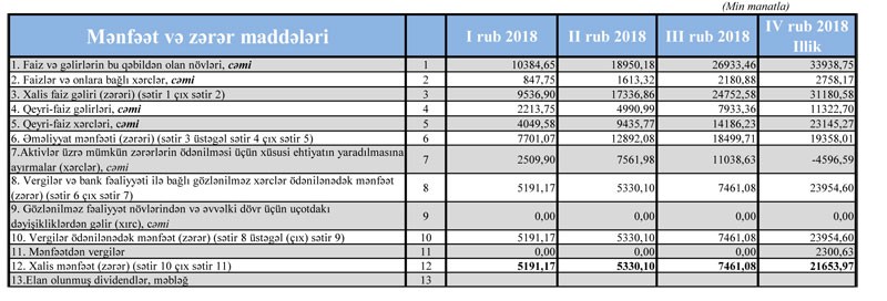Ötən il faiz və qeyri-faiz xərcləri xaric Bank 19 milyon 358 min mant əməliyyat mənfəəti əldə edib. Eyni zamanda depozit və kredit itkiləri üçün yaradılmış ehtiyatın 4 milyon 597 min manatı azad olub və mənfəətə əlavə edilib. 23 milyon 955 min manat mənfəətdən 2 milyon 301 min manat mənfəət vergisi ödənilib. Nəticədə, Bank ötən ili 21 milyon 654 min manat xalis mənfəət ilə bağlayıb.
