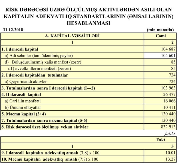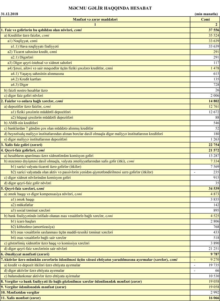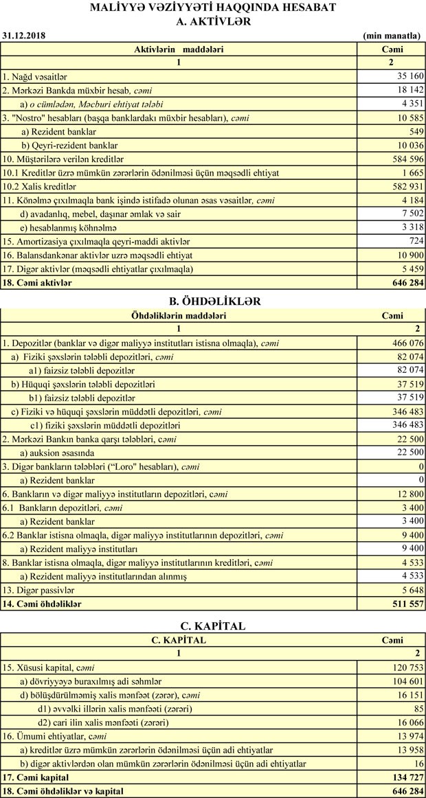 Bankın kredit portfeli 2017-cı ilin sonundakı 424 milyon 28 min manatdan 2018-ci ilin sonunda 584 milyon 596 min manata çatıb. Xalis kreditlər isə 408 milyon 214 min manatdan 582 milyon 931 min manata yüksəlib.