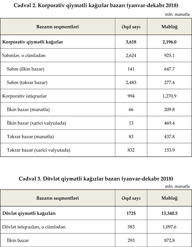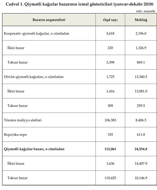 2018-ci il ərzində qiymətli kağızlar bazarında ümumilikdə 24 milyard 554.8 milyon manat həcmində əməliyyat aparılıb ki, bu da ötən ilin müvafiq dövrü ilə müqayisədə 56.2% daha çoxdur.