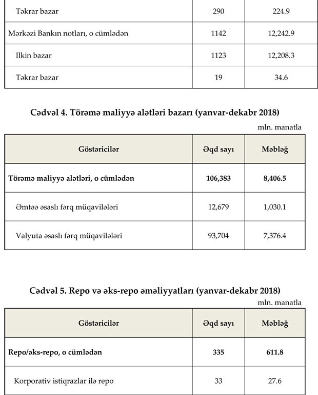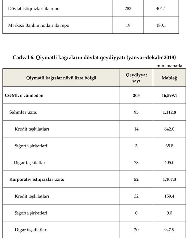 2017-ci illə müqayisədə qiymətli kağızlarla 11.9 dəfə daha çox repo əməliyyatları aparılıb. Hesabat dövrü ərzində aparılmış repo əməliyyatlarının həcmi 611.8 milyon manat (bunun da 95.5%-i və ya 584.2 mln. manatı dövlət qiymətli kağızları ilə) olub.