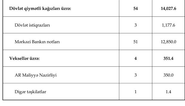Maliyyə Bazarlarına Nəzarət Palatasının yaydığı məlumata görə, əməliyyatların 58.7%-i (14 milyard 407.9 milyon manat) ilkin bazarda, 41.3%-i (10 milyard 146.9 milyon manat) isə təkrar bazarda aparılıb.