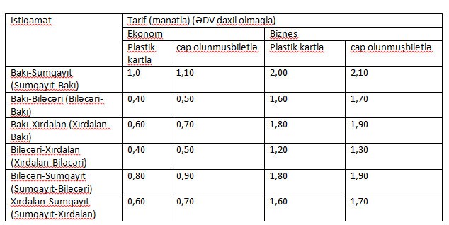 Bundan başqa, sözügedən qatarların biznes sinifli vaqonlarında gedişə olan tələbin təklifə uyğunlaşdırılması məqsədilə gediş haqqı tənzimlənəcək. Beləliklə, ekonom sinifə adi vaqonlarda gediş haqqı 0,6-1 manatdan 0,6-1,1 manata, biznes sinifə aid vaqonlarda gediş haqqı isə 1,2-1,6 manadan 1,6-2,1 manata dəyişir.