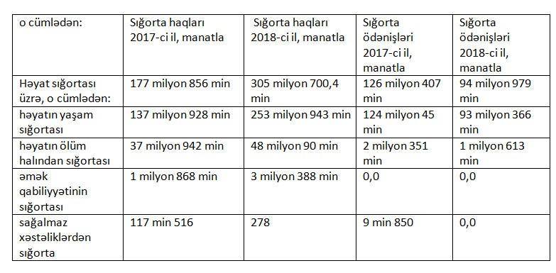2017-ci illə müqayisədə 2018-ci il ərzində Azərbaycanın 3 həyat sığortası şirkəti tərəfindən könüllü həyat sığortası növləri üzrə 305 milyon 700 min manat sığorta haqları toplanıb. Bu, 2017-ci illə müqayisədə 72% çoxdur.