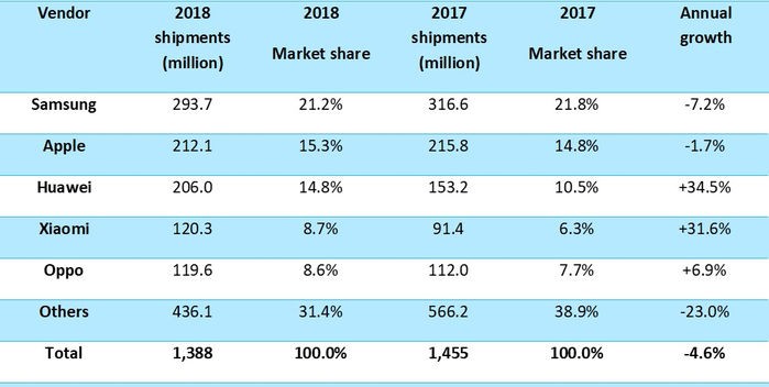 "Samsung"un ağıllı telefon satışları 2018-ci ildə 7.2 faiz azalaraq 293.7 milyona, "Apple"ın satışları isə 1.7 faiz azalma ilə 212.1 milyon ədədə geriləyib. Çinin "Huawei" və "Xiaomi" şirkətləri isə illik satışlarını müvafiq olaraq 34.5 faiz və 31.6 faiz artırıb.