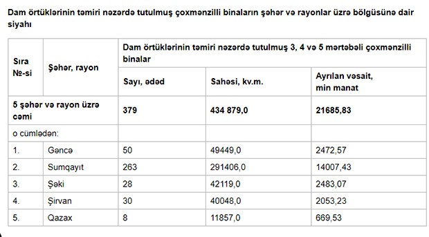 Şəhər və rayonlarda çoxmənzilli binaların təmirinə pul ayırdı