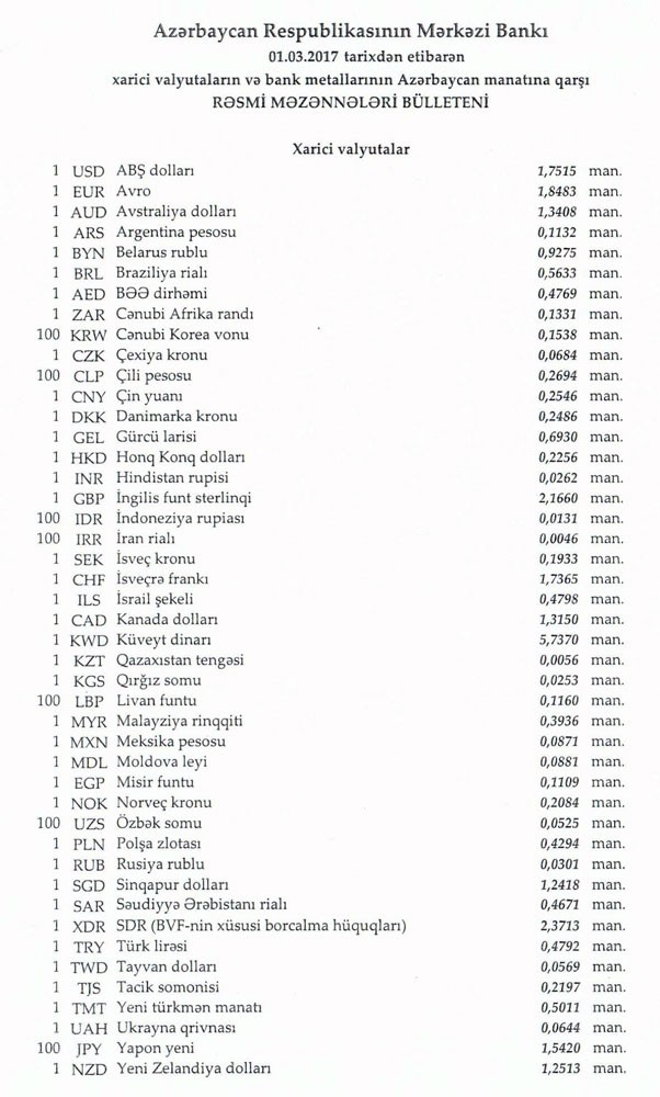 Martın 1-nə Mərkəzi Bankın açıqladığı rəsmi Dollar/manat məzənnəsi Fevralın 28-i ilə müqayisədə qalxaraq 1,7515 manat olub, Avro/manat məzənnəsi isə 1.8483 manata düşüb.
