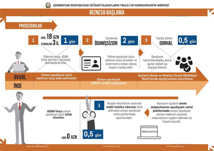 Qeyd edək ki, hüquqi şəxslərin onlayn dövlət qeydiyyatı istiqamətində aparılan islahatlar nəticəsində hüquqi şəxslərin cəmi bir prosedurla onlayn dövlət qeydiyyatına alınması üçün əlverişli şərait yaradılıb. Belə ki, bu ilin əvvəlindən başlayaraq dövlət qeydiyyatının aparılmasının (ƏDV qeydiyyatı və bank hesabının açılması da daxil olmaqla) bir prosedurla tamamlanması mümkündür. Qeydiyyatın həyata keçirilməsi üçün e-ərizənin elektron imza ilə təsdiq edilməsi zərurəti aradan qaldırılıb, eləcə də qeydiyyatla bağlı əvvəllər mövcud olan bütün prosedurlar ləğv olunub.