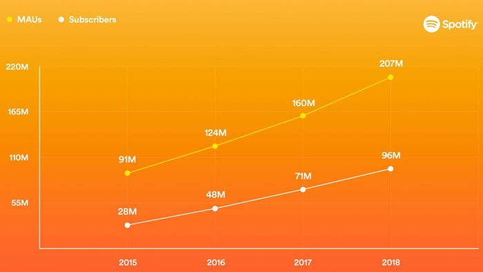 Bu istifadəçilərin 96 milyonunu aylıq ödəniş müqabilində xidmətdən istifadə edən "Spotify Premium" üzvləri təşkil edir. Premium abunəçilərin sayı son bir ildə 25 milyon artıb.