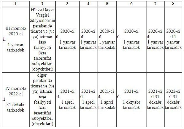 Bu proses paytaxtda olduğu kimi, paytaxtdan kənardakı pərakəndə ticarət və yaxud ictimai iaşə fəaliyyəti göstərən ƏDV ödəyicilərini də bu ilin sonuna qədər əhatə edəcək. Eyni fəaliyyəti göstərən digər təsərrüfatı subyektlərinə gəlincə isə, Gəncə və Sumqayıt şəhərlərində sahibkarlara 2021-ci il aprelin 1-nə qədər, Abşeron, Mingəçevir, Şirvan, Şəki, Lənkəran, Yevlax, Bərdə, Naxçıvan, Quba, Xaçmaz, Masallı, Göyçay, Şamaxı, Zaqatala, Şəmkir, Tovuz, Salyan, Sabirabad və Naftalanda (kənd və qəsəbələr istisna olmaqla) 2021-ci il oktyabrın 1-nə qədər, digər rayon mərkəzlərində (kənd və qəsəbələr istisna olmaqla) 2022-ci il yanvarın 1-nə qədər, bütün kənd və qəsəbələrdə isə 2023-cü il yanvarın 1-nə qədər vaxt verilib.