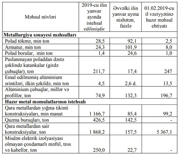 Metallurgiya sənayesi və hazır metal məmulatlarının istehsalı sahələrində yanvar ayında 46,6 milyon manatlıq məhsul istehsal olunmuş, metallurgiya sənayesində 16,1 faiz, hazır metal məmulatlarının istehsalı sahəsində isə 25,4 faiz azalma müşahidə olunmuşdur. Ay ərzində sahə üzrə 24,3 min ton (1,9 faiz çox) armatur, 74,9 ton (32,3 faiz çox) alüminium çubuqlar, millər və profillər istehsal edilmişdir.
