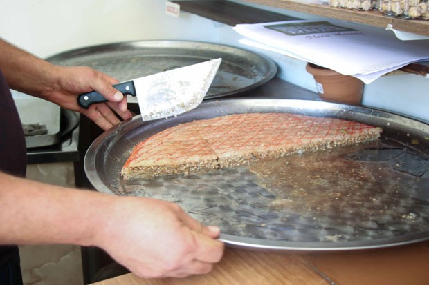 Söhbətinə davam edərək Xanlar kişi önlüyünü taxır və düyü ununun üzərinə su səpməyə başlayır. Alınan bərk xəmiri yoğuran ustad dönə-dönə deyir ki, o, duru, tam qarışmış olmalıdır. Şəki halvasının hazırlanma prosesində iştirak etmək istədiyimi dedikdən sonra müştərimiz məndən iri sinini nazik qat yağlamağımı xahiş etdi. Yağlandıqdan sonra sini ocağın üstündə qızdırılır. Həmin vaxtadək hazırlanan xəmir xüsusi, deşikli qıfa doldurularaq sininin üzərində çarpaz xətlər istiqamətlərində gəzdirildi. Açığı, təcrübəsizliyimi dərhal biruzə verdim. Bu anda qəhrəmanım sərt baxışla mənə üz tutaraq öz ləhcəsi ilə şirin dilini işə saldı: "Ha pis alınsa, özün yiyicaxsan!" Əlqərəz, lavaş vam ocaqda yarım dəqiqədən çox bişirilir. Bu qayda ilə xəmir bitənədək riştələr bişməlidir. Ardınca riştələri başqa sinidə üst-üstə düzdük. Qovrulub xırdalanmış fındıq elə xırdalanmış keşniş toxumu ilə qarışdırılır. Altı qat riştə düzəndən sonra onların sinidən kənara çıxan hissələri səliqə ilə kəsilir. Bunları da səliqə ilə ayırıb döşəmək lazımdır. Təxminən 1 sm qalınlıqda iç yayılır. Üstünə bir qat riştə döşənir və yenə 1 sm qalınlıqda iç yayılır.