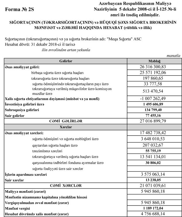 “Meqa Sığorta” ASC 2018-ci ili 4 milyon 757 min manat xalis mənfəət ilə başa vurub. Bu rəqəm, 2017-ci ilin xalis mənfəət rəqəmi ilə müqayisədə 4,3% azdır. Belə ki, şirkət 2017-ci ili 4 milyon 968 min manat xalis mənfəətlə bağlamışdı.