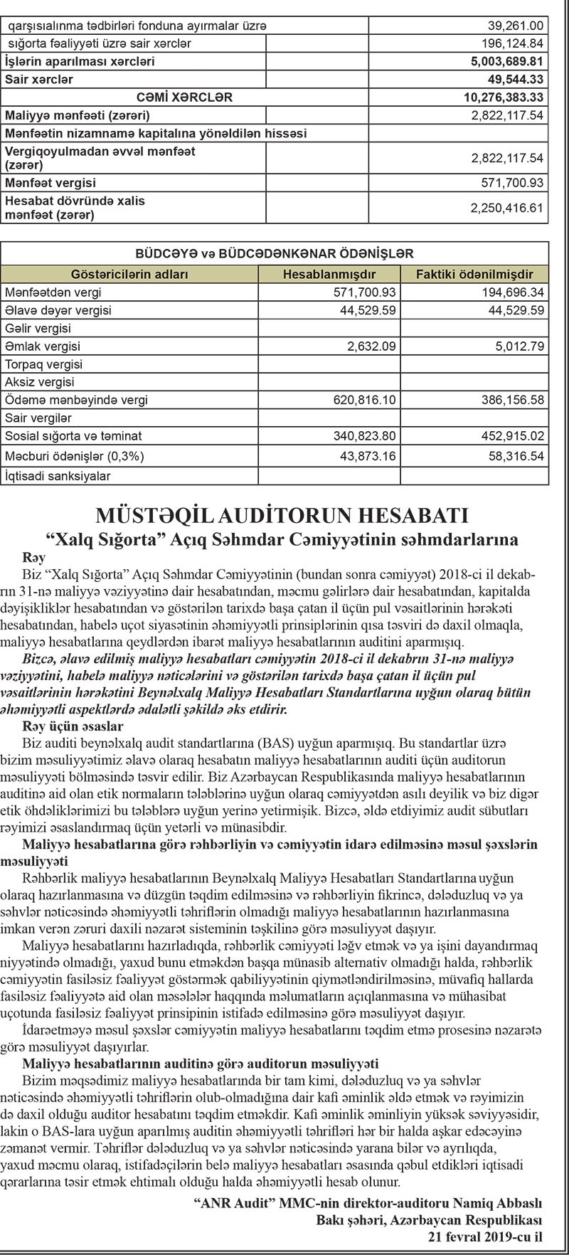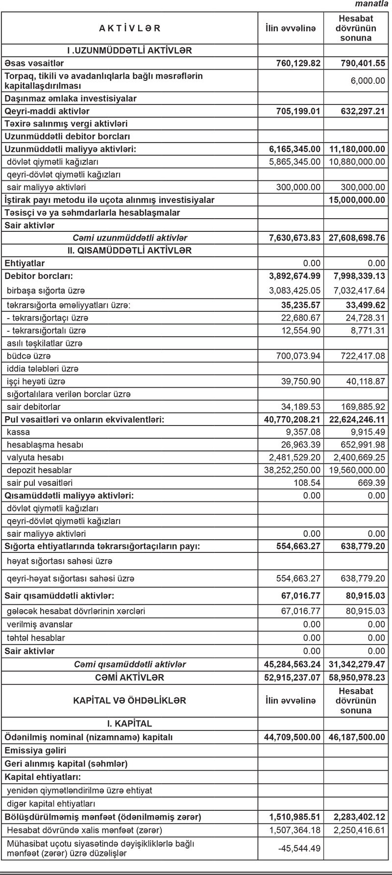“Xalq Sığorta” ASC-nin 2018-ci il dekabrın 31-nə mühasibat balansı