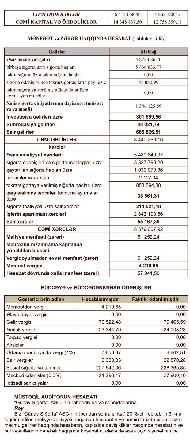 “Marja” Şirkətin maliyyə hesabatlarına istinadən xəbər verir ki, ötən il “Günay Sığorta”nın cəmi gəlirləri 8 milyon 440 min manat, cəmi xərcləri 8 milyon 379 min manat təşkil edib. Nəticədə şirkətin 61 min 252 manat maliyyə mənfəəti formalaşıb. Maliyyə mənfəəətindən 4 min 210 manat mənfəət vergisi ödənilib.