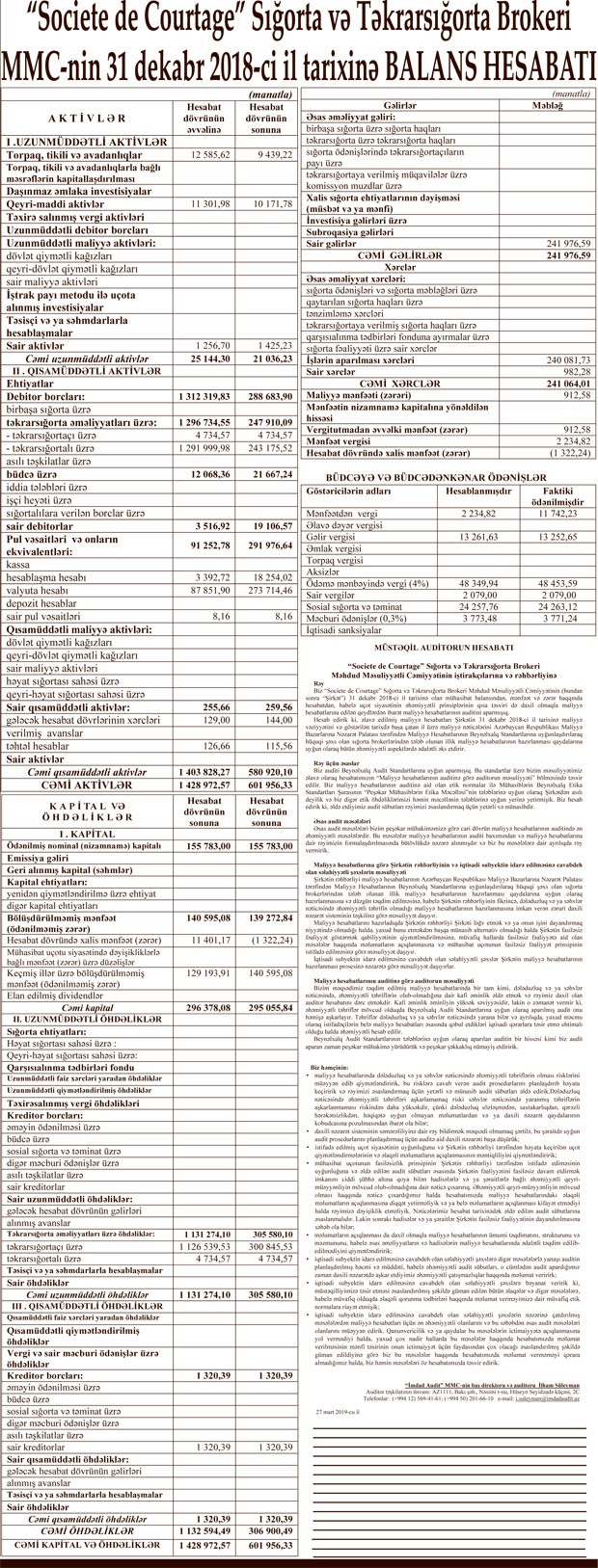 “Marja” Şirkətin maliyyə hesabatına istinadən xəbər verir ki, ötən il “Societe de Courtage”ın cəmi gəlirləri 241 min 976 manat, cəmi xərcləri isə 241 min 64 manat təşkil edib. 912 manat mənfəətdən 2 234 manat mənfəət vergisi hesablandığından Şirkət ötən ili 1322 manat zərərlə başa vurub.