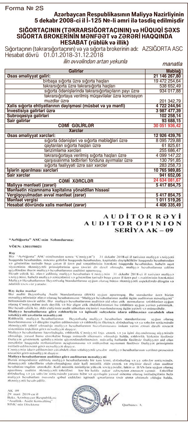“Marja” şirkətin maliyyə hesabatına istinadən xəbər verir ki, ötən il “Azsığorta”nın cəmi gəlirləri 30 milyon 51 min manat, cəmi xərcləri isə 24 milyon 634 min manat təşkil edib. Şirkət 5 milyon 417 min manat maliyyə mənfəətindən 1 milyon 11 min manat mənfəət vergisi ödəyib.