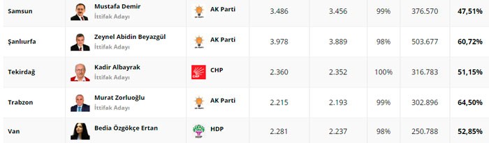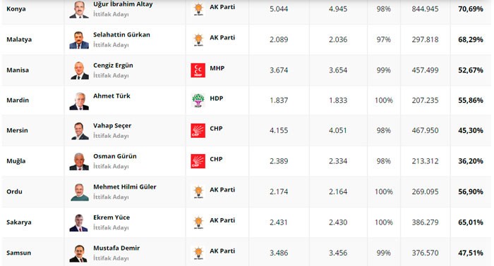Həmçinin səslərin 51.67%-ni "Cumhur" ittifaqı (AK PARTİ, MHP), 37.53%-ni "Millet" ittifaqı (CHP, İYİ PARTİ) toplayıb.