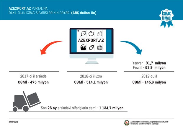 Göstərilib ki, 2019-cu ilin yanvar-fevral aylarında Azexport.az portalına 145,6 milyon ABŞ dolları dəyərində ixrac sifarişləri daxil olub. 2018-ci ilin müvafiq dövrü ilə müqayisədə 2019-cu ilin yanvar-fevral aylarında Azexport.az portalına daxil olan ixrac sifarişləri dəyər baxımından 22,3 faiz artıb.
