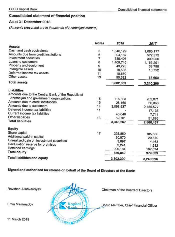 İllik hesabata görə, 31 Dekabr 2018-ci il tarixində "Kapital Bank"ın cəmi aktivləri 3 milyard 802 milyon manat, o cümlədən müştərilərə verilmiş kreditlər 1 milyard 410 milyon manat təşkil edib. Yerli standartlar əsasında tərtib edilmiş hesabatda Bankın cəmi aktivlərinin 3 milyard 716 milyon manat, o cümlədən müştərilərə verilmiş kreditlərin 1 milyard 500 milyon manat olduğu qeyd edilmişdi.
