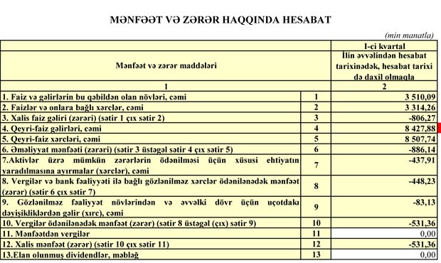 Müqayisə üçün qeyd edək ki, 2018-ci ilin yanvar-mart dövründə “AGBank”ın cəmi gəlirləri 11 milyon 348 min manat, cəmi xərcləri 13 milyon 616 min manat, əməliyyat zərəri 2 milyon 268 min manat təşkil etmişdi. Eyni zamanda, AGBank” ehtimal olunan depozit və kredit itkiləri üçün ehtiyata 952 min manat ayırdığından zərəri 3 milyon 220 min manata yüksəlmişdi.