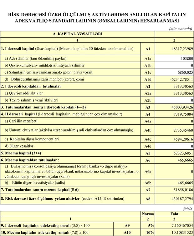 31 Mart 2019-cu il tarixində "AGBank" 51 milyon 858 min manat məcmu kapitala malik olub ki, bu da 50 milyon manat olan minimal tələbdən yüksəkdir.