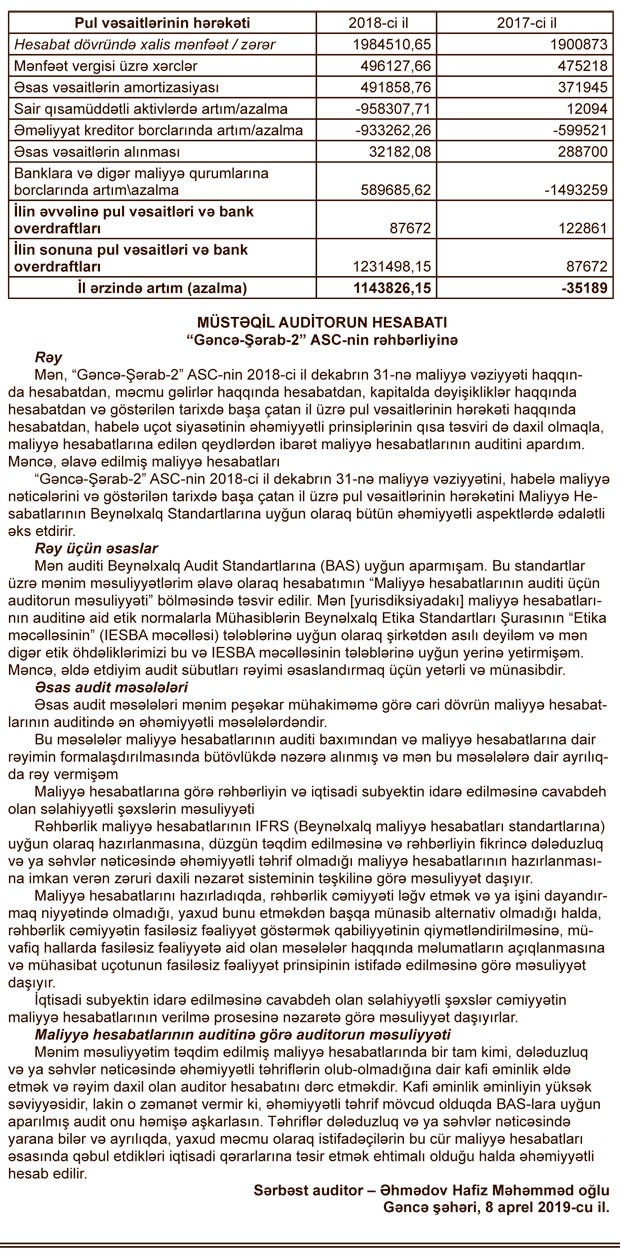 Şərab, konyak, araq və spirt istehsalı ilə məşğul olan “Gəncə-Şərab-2” ASC 2018-ci ili 1 milyon 984 min manat xalis mənfəət ilə başa vurub. Bu, 2017-ci illə müqayisədə 83 min manat və ya 4,4% çoxdur. ASC 2017-ci ili 1 milyon 901 min manat xalis mənfəətlə bağlamışdı.