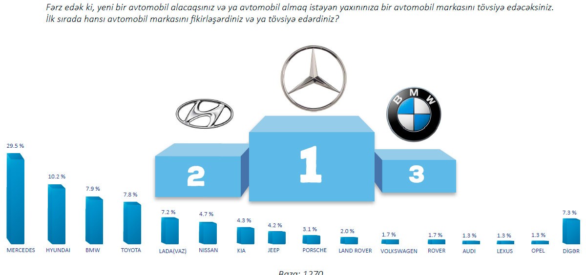 Azərbaycanılıara ən çox xitab edən marka Mercedes Benzdir. 1270 nəfər arasında həyata keçirilən sorğuda Mercedes Benz səslərin 29,5%-ni alaraq birinci olub. Hyundai isə Mercedes Benz-dən sonra 10.2% səs alaraq ikinci seçilib. Ən çox tövsiyə edilən marka sualının üçüncüsü isə 7,9% səslə BMW və Toyota olub.