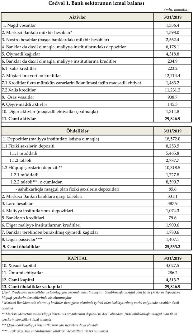 31 mart 2019-cu il tarixinə Azərbaycanda fəaliyyət göstərən bankların cəmi aktivləri 29 milyard 846 milyon 900 min manat təşkil edib. Bu “Marja”ya Maliyyə Bazarlarına Nəzarət Palatasından bildirilib.