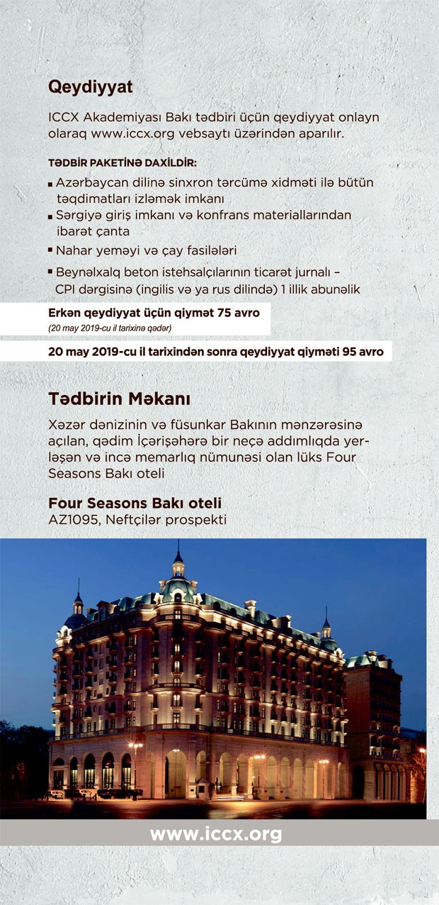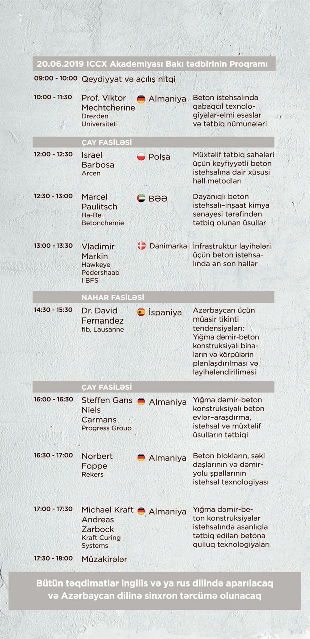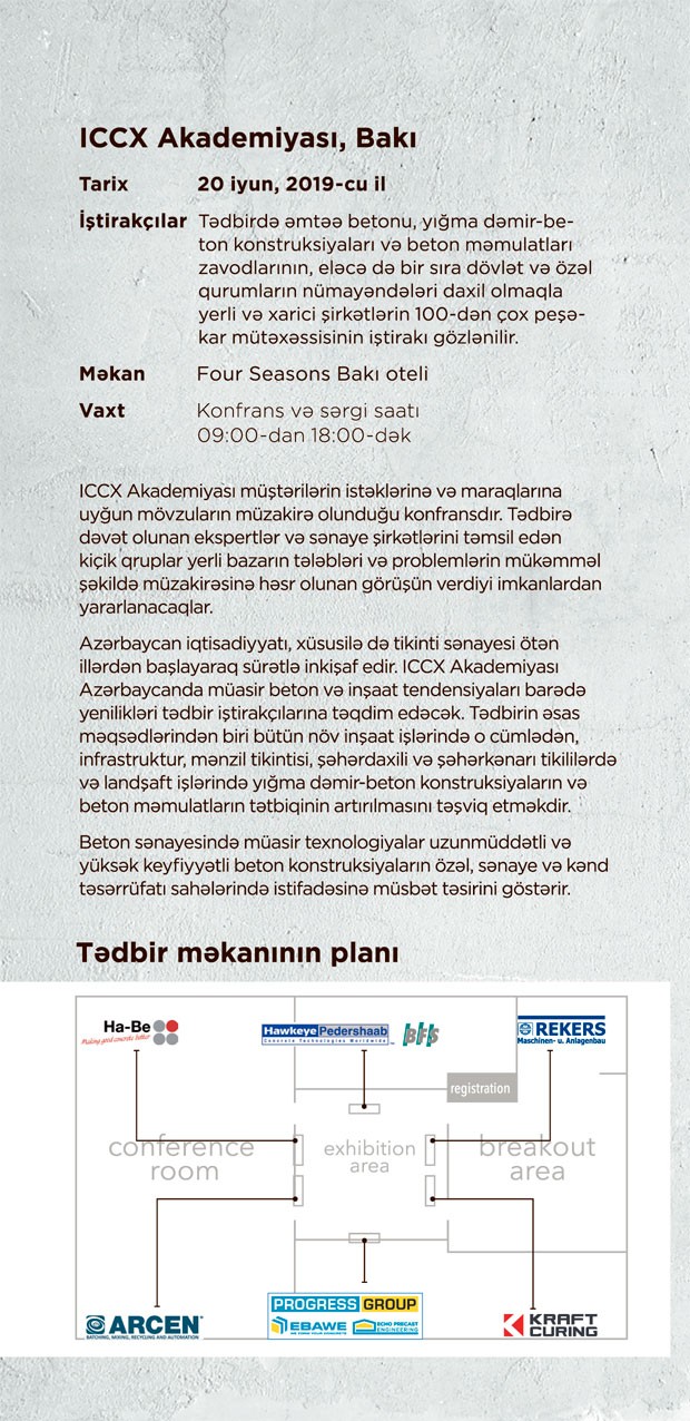 Tədbir 100-dən çox yerli və xarici şirkət nümayəndələrinin iştirakı ilə cari ilin iyun ayının 20-si, Four Seasons otelində keçiriləcək. Tədbirdə Almaniyanın Progress Group, Rekers, Kraft Curing Systems, Ha-Be Betonchemie, Polşanın Arcen, Danimarkanın Hawkeye Pedershaab və İspaniyanın Lausanne şirkətlərinin nümayəndələri çıxış edəcəklər.