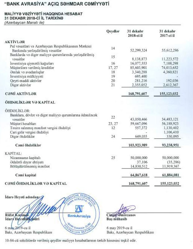Auditorun hesabatına görə, “Bank Avrasiya” 2018-ci ili 4 milyon 732 min manat xalis mənfəətlə başa vurub. Bank 2017-ci ili 3 milyon 267 min manat xalis mənfəətlə bağlamışdı. Mənfəətin artması ehtimal olunan kredit zərərlərinin qaytarılması üçün yaradılan ehtiyata ayırmanın azalması ilə bağlıdır. 2017-ci ildə faiz gəlirlərinin 3 milyon 521 min manatı ehtiyata ayrılmışdı. Ötən isə ehtiyatın 578 min manatı azad olaraq gəlirə əlavə edilib.