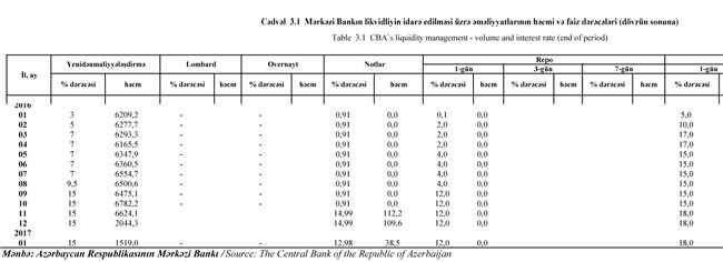 Mərkəzi Bank 2017-ci ilin fevral ayının 1-i tarixinə likvidliyin idarə edilməsi üzrə əməliyyatlarının həcmi və faiz dərəcələrini açıqlayıb.