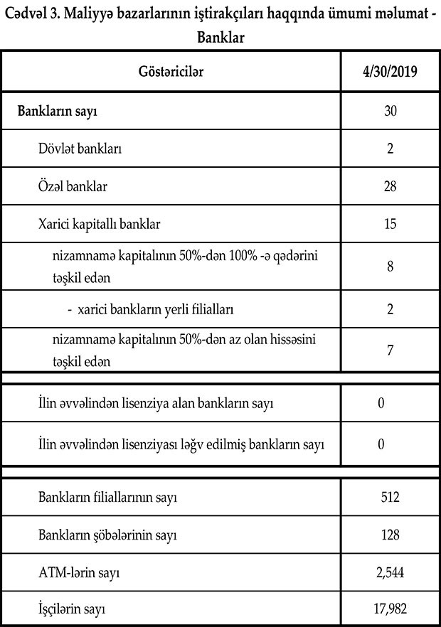 Fəaliyyət göstərən 30 bankın filiallarının sayı 512, şöbələrinin sayı 128, ATM-lərin sayı 2,544 olub. Bank sektorunun işçi heyətinin sayında artım aprel ayında da davam etmişdir. Belə ki, 2019-cu ilin aprel ayında işçi sayı 1.3% (233 nəfər) artaraq 17 982 nəfər təşkil edib.