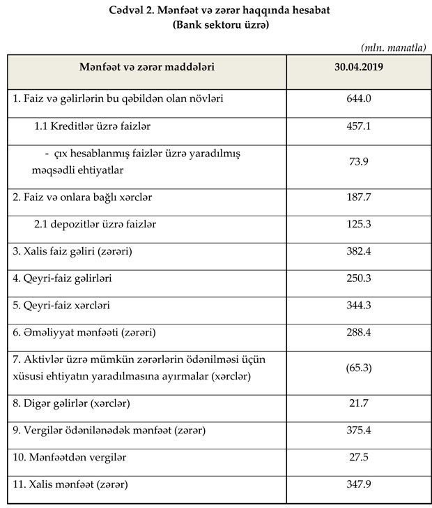 Bank sektoru 2019-cu ilin yanvar-aprel dövrünü 347.9 milyon manat xalis mənfəət ilə başa vurub.Halbuki, sektor ötən ilin eyni dövrünü 57.1 milyon manat xalis zərərlə bağlamışdı. Ötən ilin ilk 4 ayında banklar aktivlər üzrə mümkün zərərlərin ödənilməsi üçün xüsusi ehtiyatın yaradılmasına 242.5 milyon manat ayırmışdılar. Bu ilin eyni dövründə ehtiyatın 65.3 milyon manatı azad olaraq mənfəətə əlavə olunub.