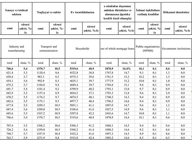 Kənd təsərrüfatı, sənaye və istehsal sektorlarına verilən kreditlər artıb.