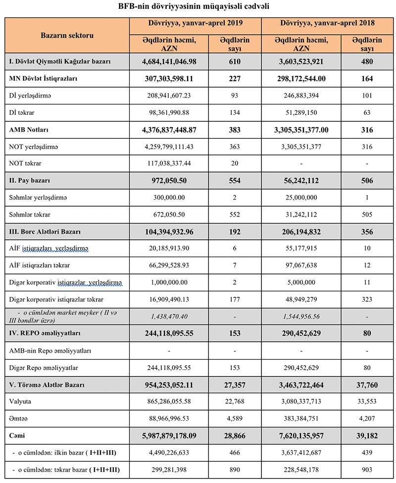 2019-cu ilin yanvar-aprel ayları ərzində Bakı Fond Birjasında bütün alətlər üzrə keçirilən əqdlərin ümumi həcmi 5 milyard 987 milyon 879 min manat təşkil etmişdir.