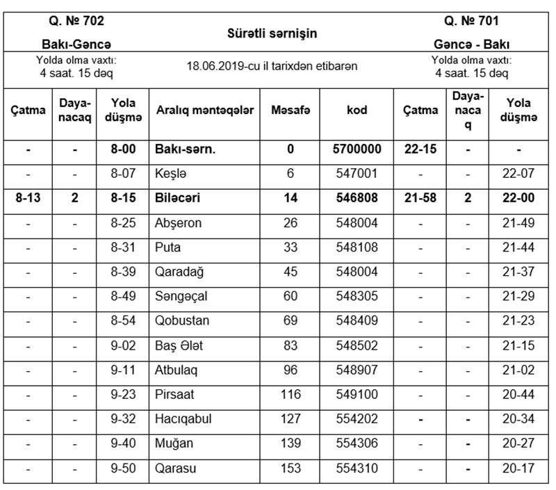 Bakı-Gəncə-Bakı istiqamətində hərəkət edən 702/701 nömrəli sürətli sərnişin qatarının hərəkət qrafikinin optimallaşdırılması məqsədi ilə, Bakıdan və Gəncədən 18.06.2019-cu il tarixdən etibarən qeyd edilən qatarın hərəkət cədvəli dəyişdirilir.