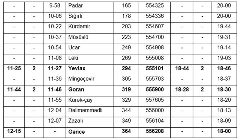 “Azərbaycan Dəmir Yolları”nın yaydığı məlumatda bildirilir ki,qatar Bakıdan saat 08:00-da yola düşəcək, Gəncəyə saat 12:15-də çatacaq. Gəncədən qatar saat 18:00-da yola düşəcək, Bakıya saat 22:15-də çatacaq.