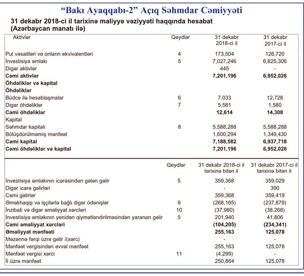 Həmçinin “Bakı Ayaqqabı -2” investisiya əmlakının yenidən qiymətləndirilməsindən 202 min manat gəlir əldə edib. 561 min manat ümumi gəlirə qarşı xərclər 306 min manat təşkil etdiyindən 255 min manat mənfəət yaranıb. Mənfəətdən 4 min manat vergi ödənilib.