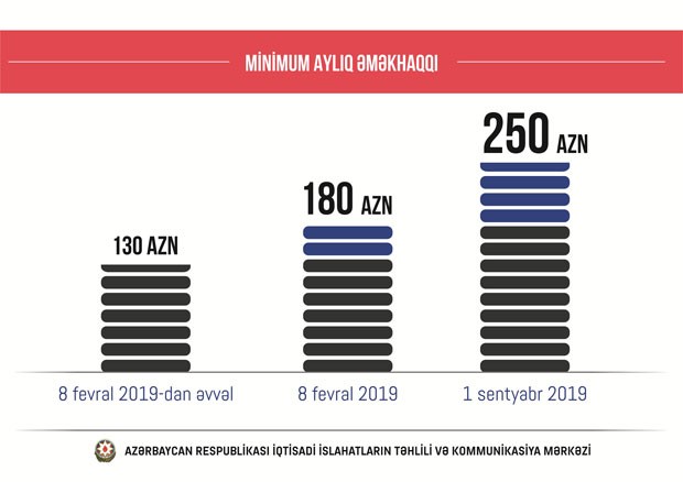 Vüsal Qasımlı bildirib ki, ölkə başçısı tərəfindən minimum əməkhaqqı məbləği 40 faizə yaxın artırılaraq 250 manata çatdırılıb ki, bu da özəl sektorda çalışan 350 min vətəndaşla yanaşı, dövlət sektorunda Vahid Tarif Cədvəli əsasında əməkhaqqı alan 600 minə yaxın şəxsin əməkhaqqının artımına səbəb olacaqdır.