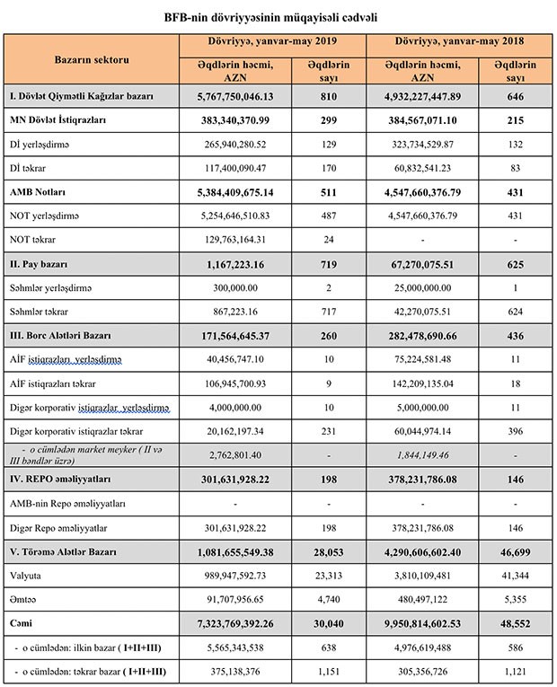 2019-cu il yanvar-may ayları ərzində Bakı Fond Birjasında bütün alətlər üzrə keçirilən əqdlərin ümumi həcmi 7 milyard 323 milyon 769 min manat təşkil edib. Bu, 2018-ci ilin eyni dövrü ilə müqayisədə 26,4% azdır.