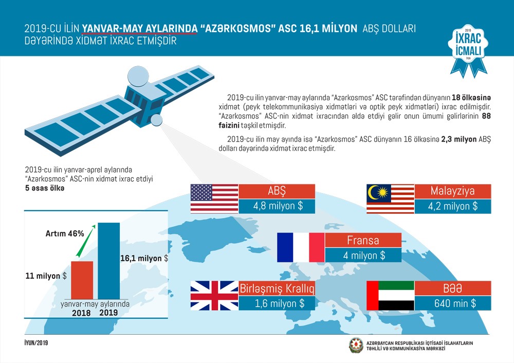 “Azərkosmos” ASC-nin xidmət ixracından əldə etdiyi gəlir onun ümumi gəlirlərinin 88 faizini təşkil edib. 2019-cu ilin may ayında isə “Azərkosmos” ASC dünyanın 16 ölkəsinə 2,3 milyon ABŞ dolları dəyərində xidmət ixrac edib.