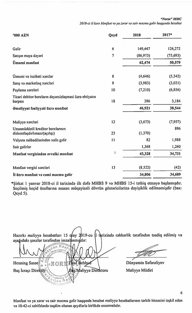 Gəlirlərin xərclərdən daha çox artması mənfəətin artmasında da əks olunub. 2017-ci illə müqayisədə ötən il mənfəət vergisindən əvvəlki mənfəət 24,7% artaraq 43 milyon 328 min manat təşkil edib. Ötən il “Norm” MMC 8 milyon 522 min manat mənfəət vergisi ödədiyindən mənfəəti 34 milyon 806 min manata düşüb. “Norm” 2017-ci ildə cəmi 42 manat mənfəət vergisi ödəmişdi. 2018-ci ildə mənfəət vergisinin ödənilməsi xalis mənfəətin daha çox artmasına imkan verməyib.