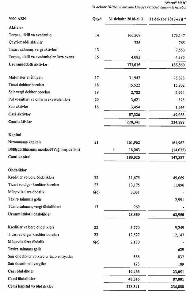 Azərbaycanın iri sement istehsalçılarından biri olan “Norm” MMC 2018-ci ili 34 milyon 806 min manat xalis mənfəət ilə başa vurub. Müqayisə üçün qeyd edək ki, “Norm” 2017-ci ili 34 milyon 689 min manat xalis mənfəət ilə bağlamışdı. Beləliklə, illik müqayisədə “Norm”un xalis mənfəəti cüzi artıb.