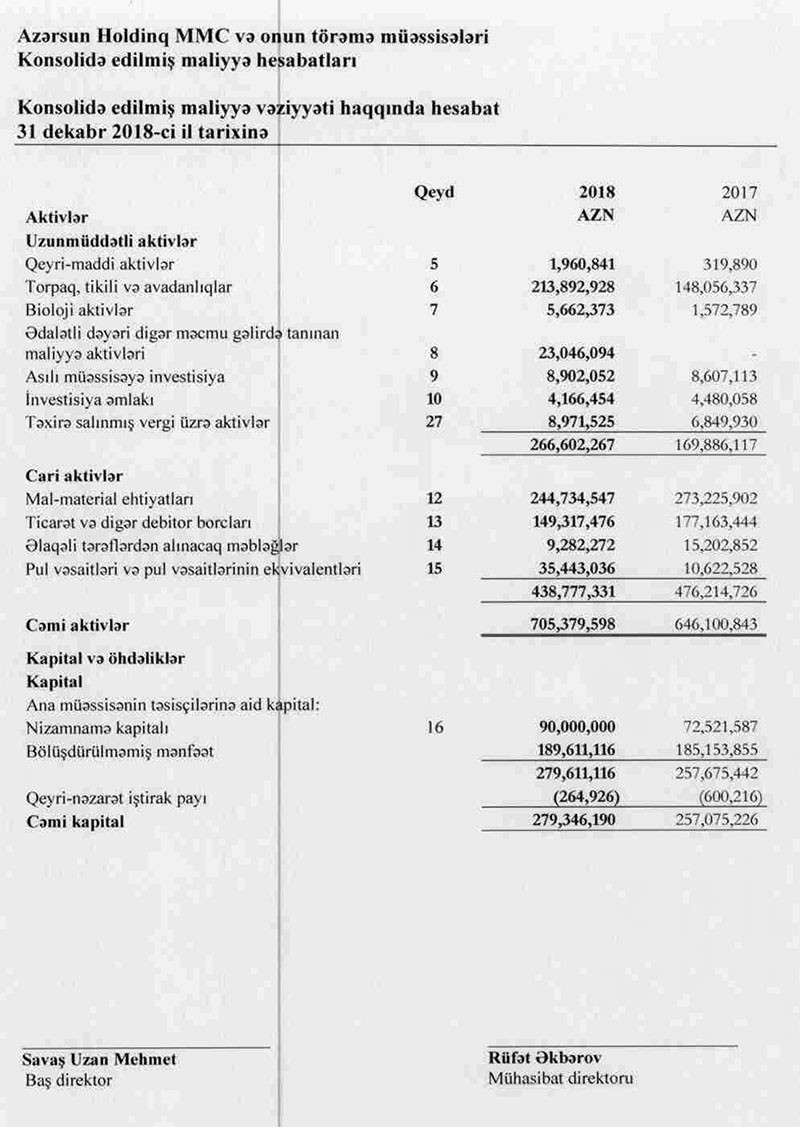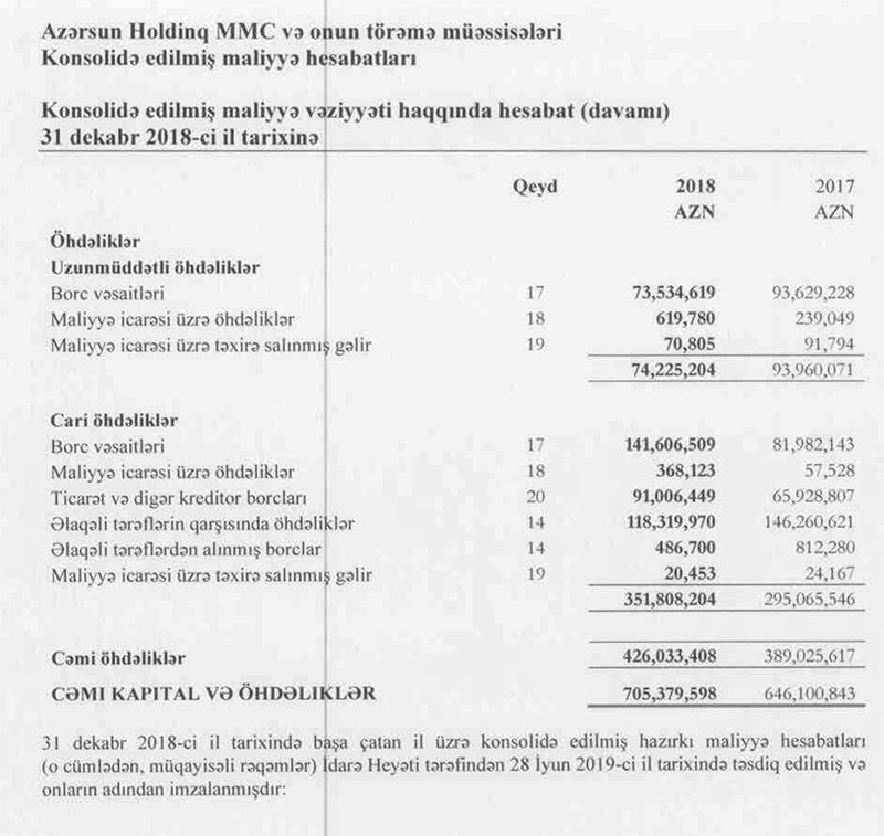 İl ərzində holdiqnin aktivləri 646 milyon 100 min manatdan 705 milyon 380 min manata qalxıb. Ötən il "Azərsun Holdinq"in nizamnamə kapitalı 24% artırılaraq 90 milyon manata çatdırılıb. Holdinqin 189 milyon 611 min manat bölüşdürülməmiş mənfəəti daxil cəmi kapitalı 279 milyon 346 min manat təşkil edib. Ötən il "Azərsun"un öhdəlikləri borclarının artması ilə əlaqədar olaraq 9,5% artaraq 426 milyon 33 min manata yüksəlib.