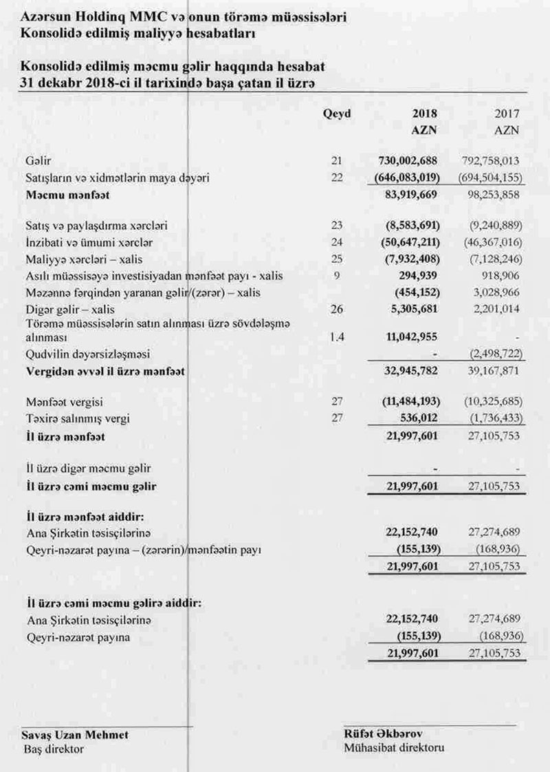 “Marja”, “Azərsun Holdinq” və onun törəmə müəssisələrinin konsolidə edilmiş maliyyə hesabatlarına istinadən xəbər verir ki, 2017-ci ildə 792 milyon 758 min manat təşkil etmiş satışdan gəlirlər 2018-ci ildə 730 milyon 2 min manata düşüb.