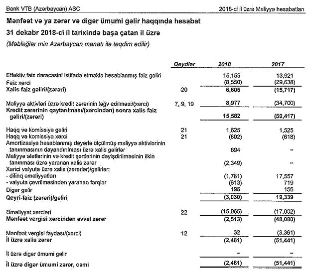 Hesabatda qeyd edilib ki, Bank VTB (Azərbaycan) ASC 2018-ci ili 2 milyon 481 min manat xalis zərər ilə başa vurub. Bu, 2017-ci illə müqayisədə təxminən 21dəfə azdır. Bank 2017-ci ili 51 milyon 441 min manat xalis zərər ilə bağlamışdı.
