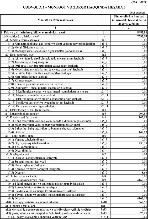 2019-cu ilin 1-ci yarısında 10 milyon 666 min manat cəmi gəlirlərə qarşı cəmi xərclər 8 milyon 819 min manat təşkil edib. Nəticədə 1 milyon 846 min manat mənfəət formalaşıb. Bank mənfəətdən 43 min manat mənfəət vergisi ödəyib.
